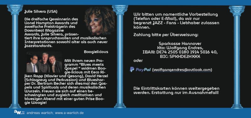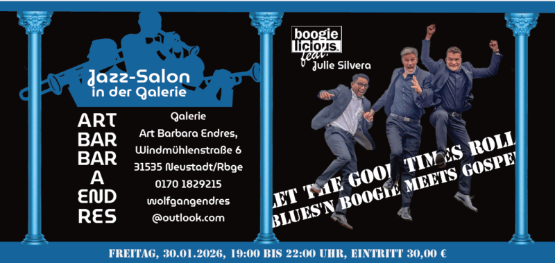 AllgemeinBOOGIELICIOUS mit der Blues- und Jazz-Sängerin Julie Silvera (USA) – Galerie Endres Veröffentlicht am 3. Januar 20266. Januar 2026 von baumann 03 Jan. baumann Weihnachts- und Neujahrsgrüße Vorankündigung Kulturstammtisch am 11.03.2026